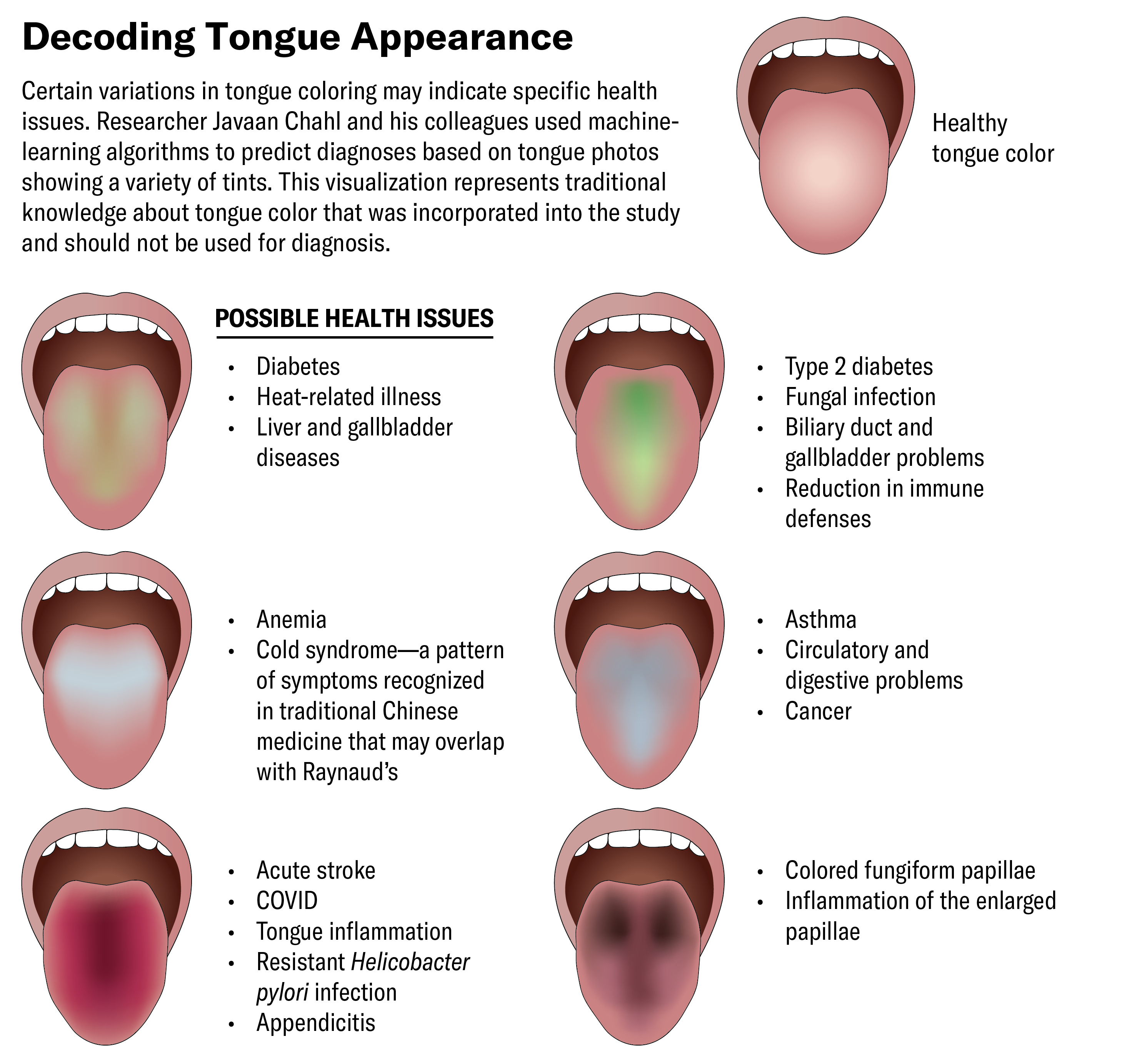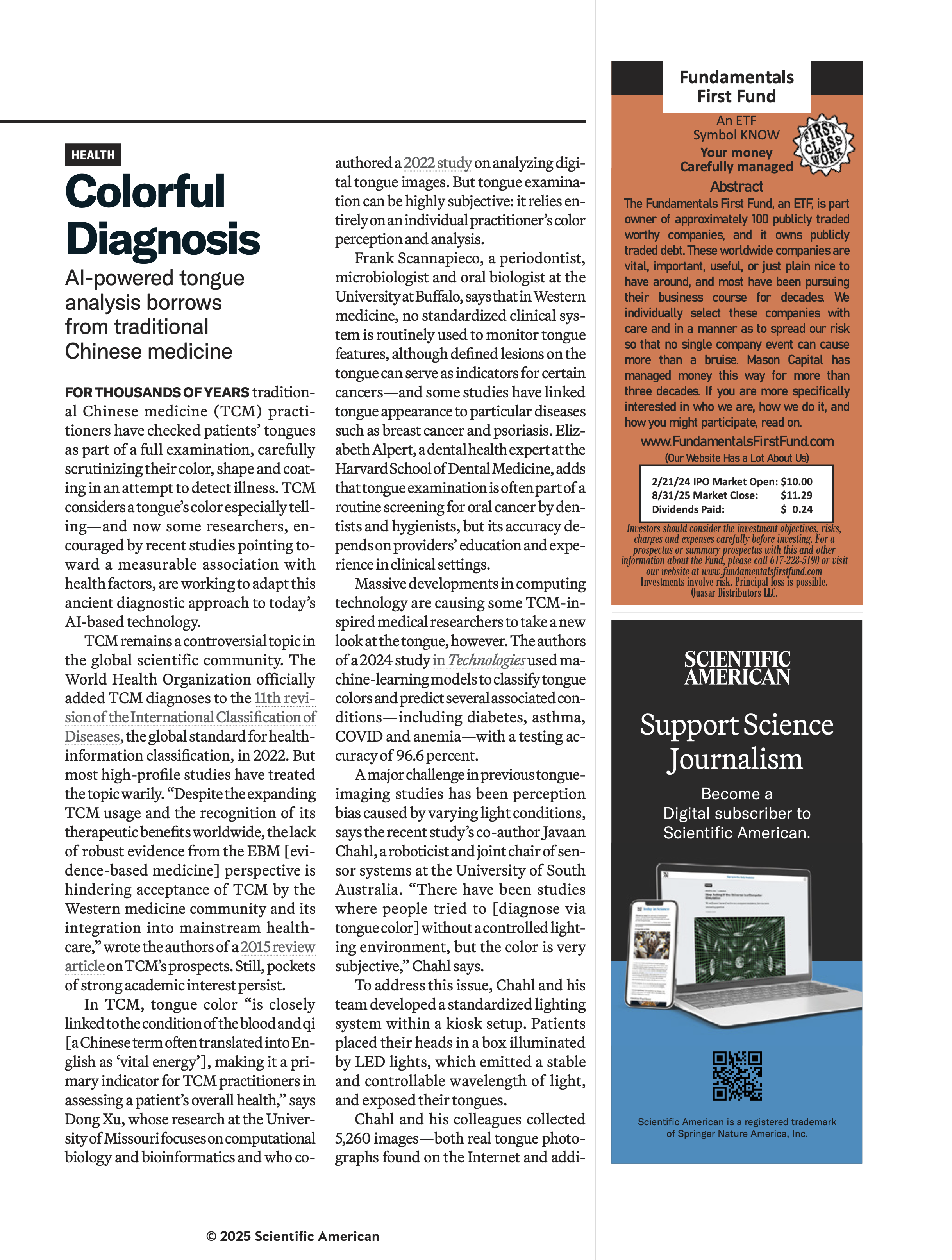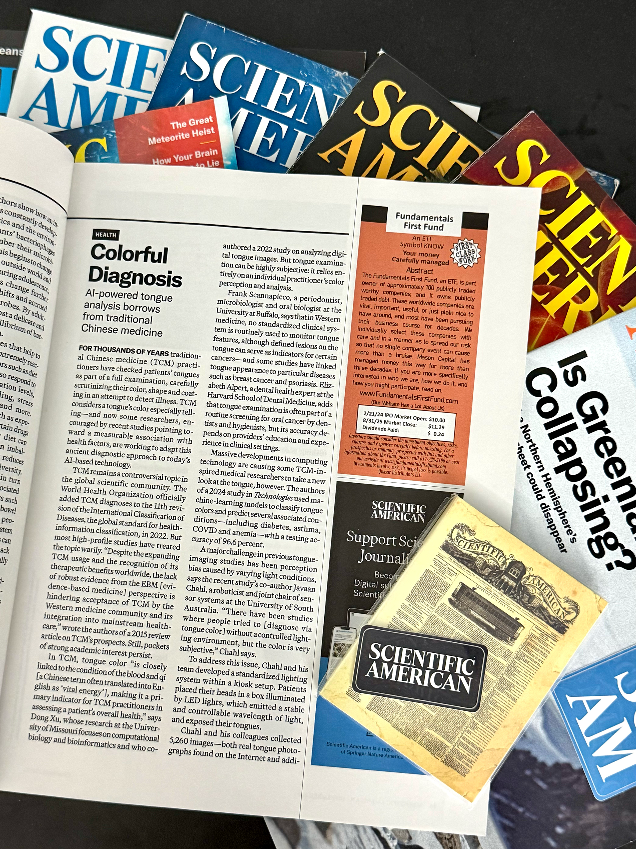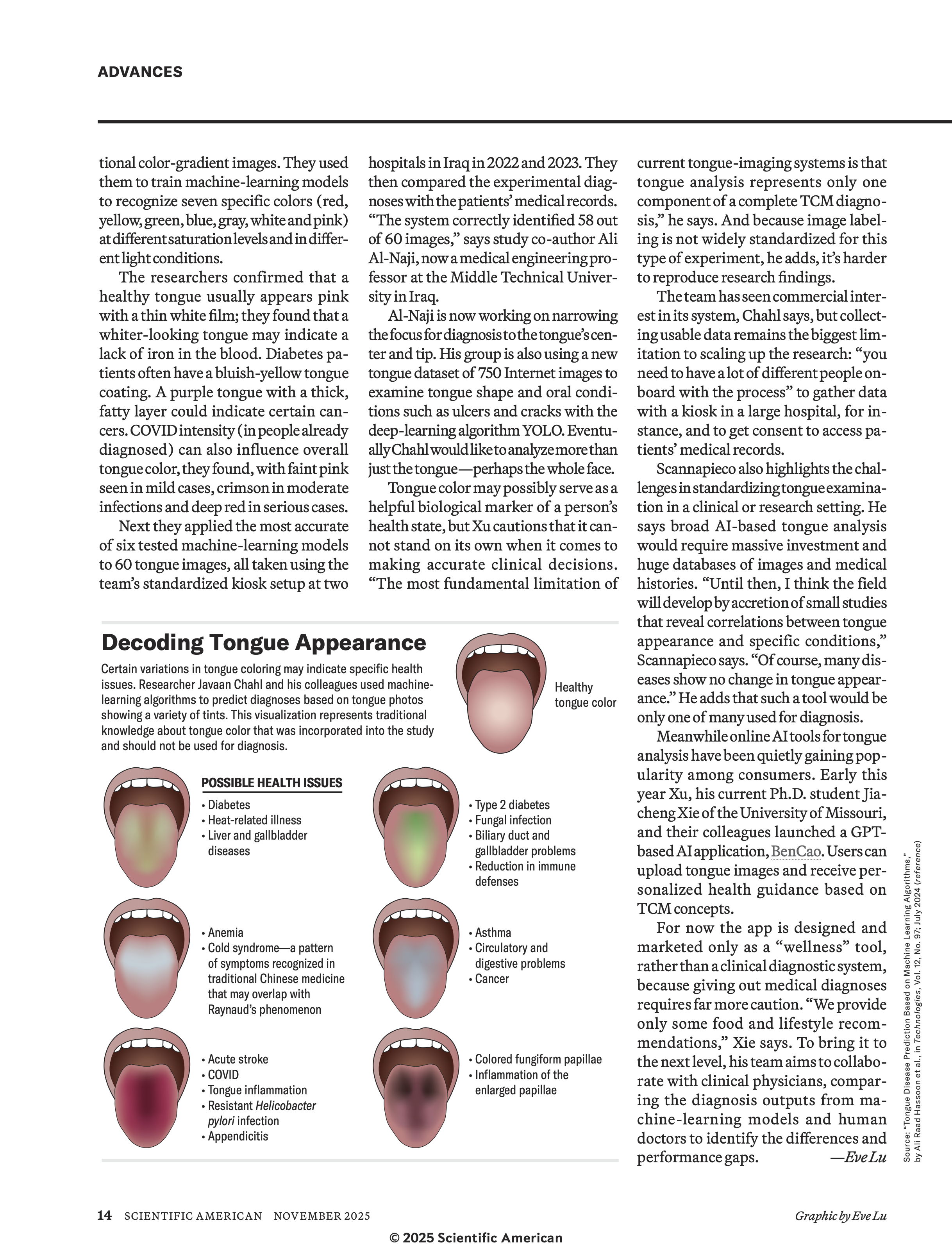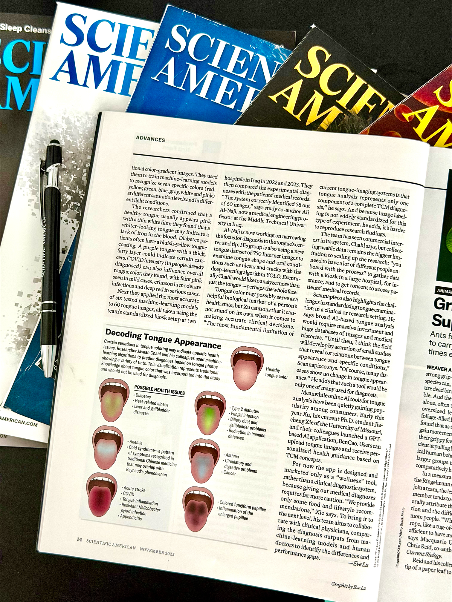 My first solo byline for a Scientific American story AI Reads Your Tongue Color to Reveal Hidden Diseases, edited by Sarah Lewin Frasier and Dean Visser (text) and Amanda Montañez (graphics), is published in the November 2025 print issue as part of the magazine's Advances coverage. I reported and created graphics for the piece, which is now live online too.