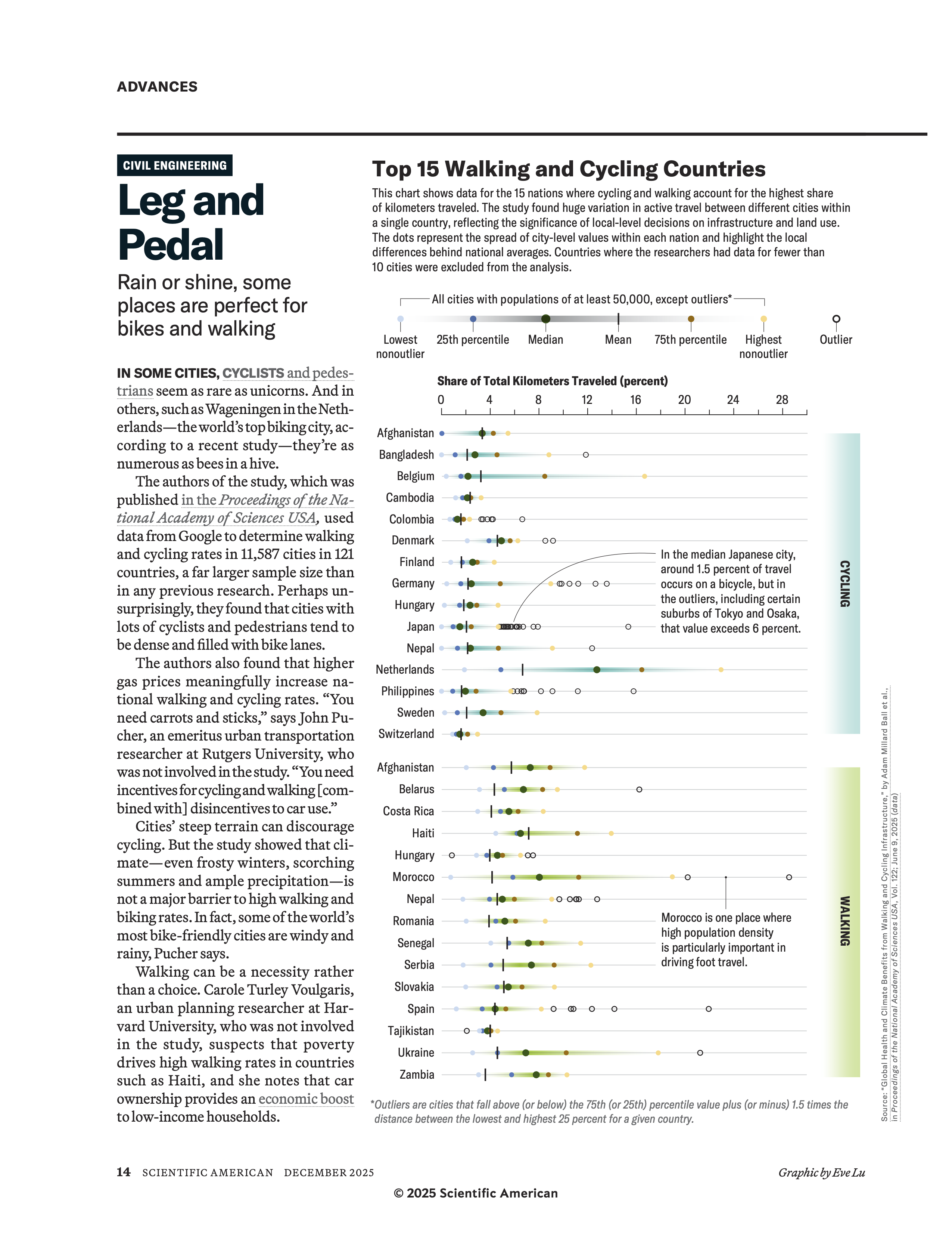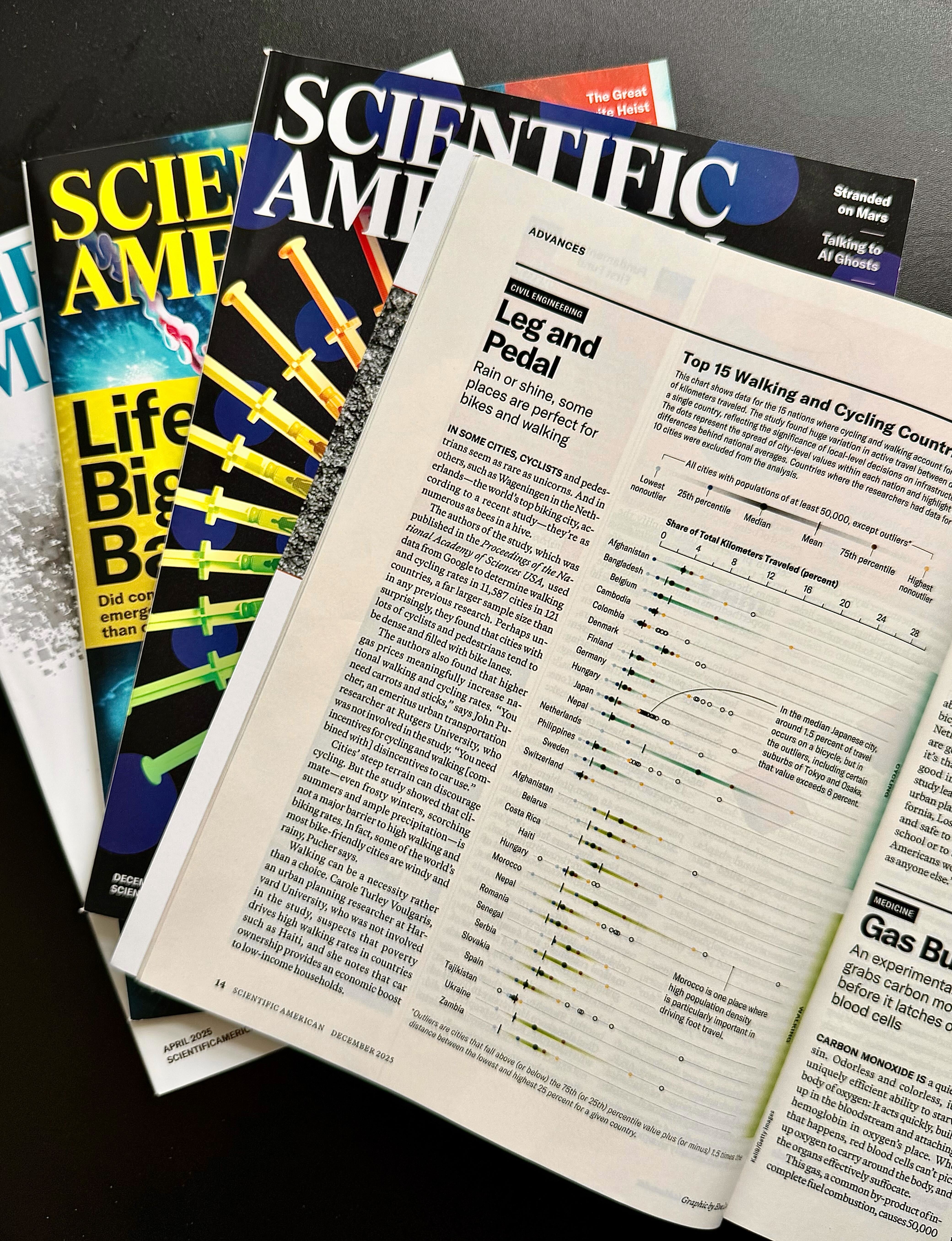 For a Scientific American story Leg and Pedal by Jesse Greenspan, I designed the graphic using data from 11,587 cities and pinpointed the TOP 15 places across the world which one study found that are just better for bikes and pedestrians. The article was published in the December 2025 print issue as part of the magazine's Advances coverage.