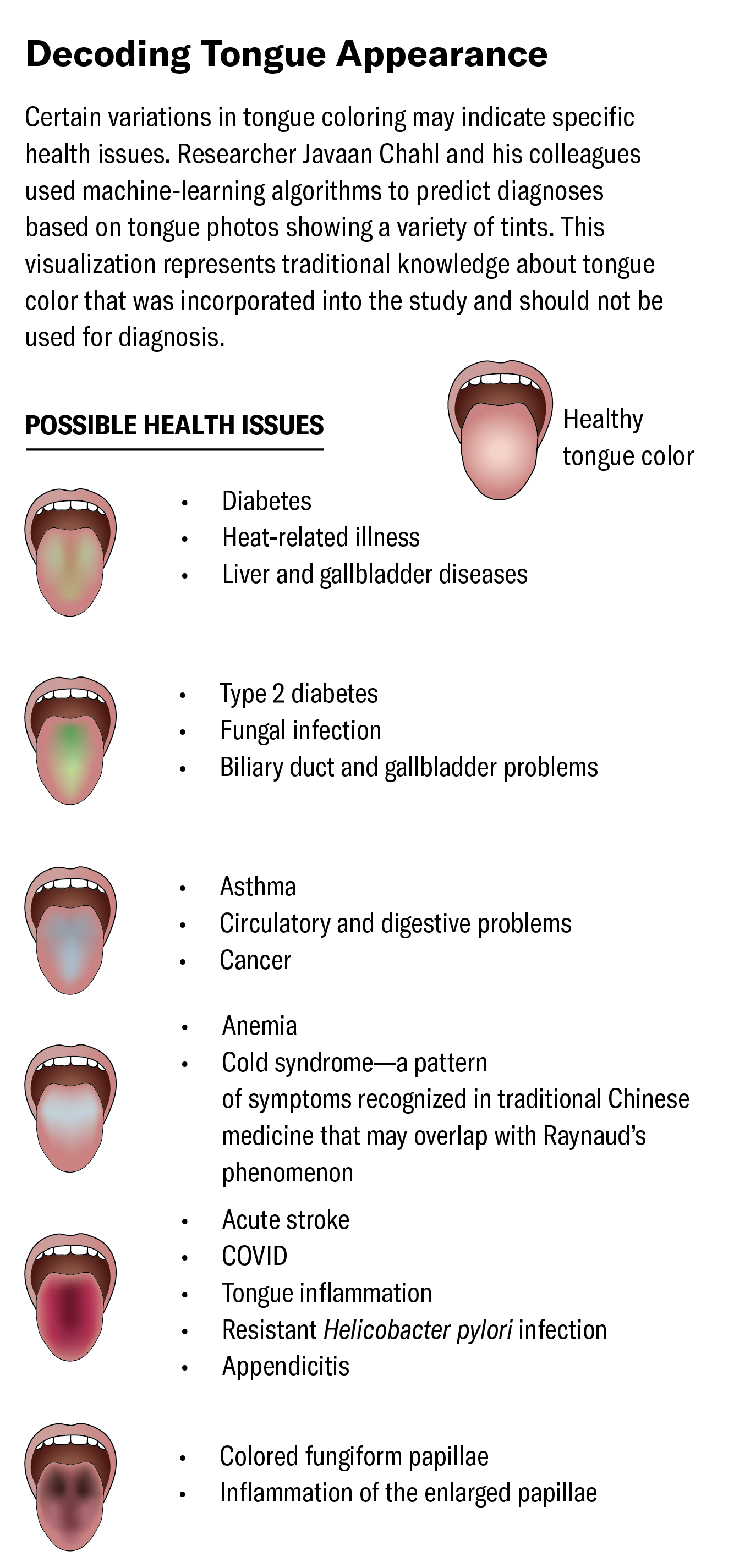 The story looks at a study where researchers trained machine-learning models on thousands of tongue images to classify colors and predict conditions such as diabetes, COVID-19, and anemia, achieving diagnostic accuracy over 96%.