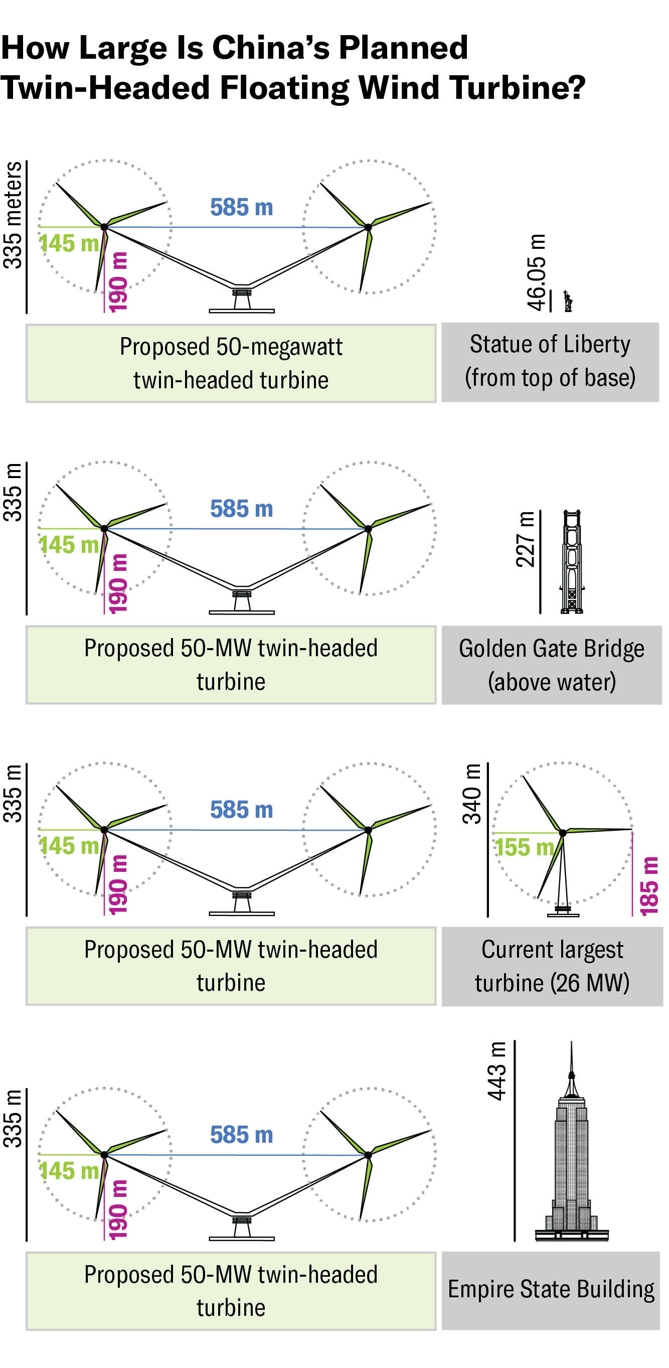 For a Scientific American story The World's Largest Wind Turbine Will Smash Previous Records by Xiaoying You, I created a comparison illustration to show how large China's proposed supersized two-rotor floating wind turbine would be–the design will soon break the current record held by Dongfang Electric’s 26 MW turbine, with a tower as tall as a 63-story skyscraper.