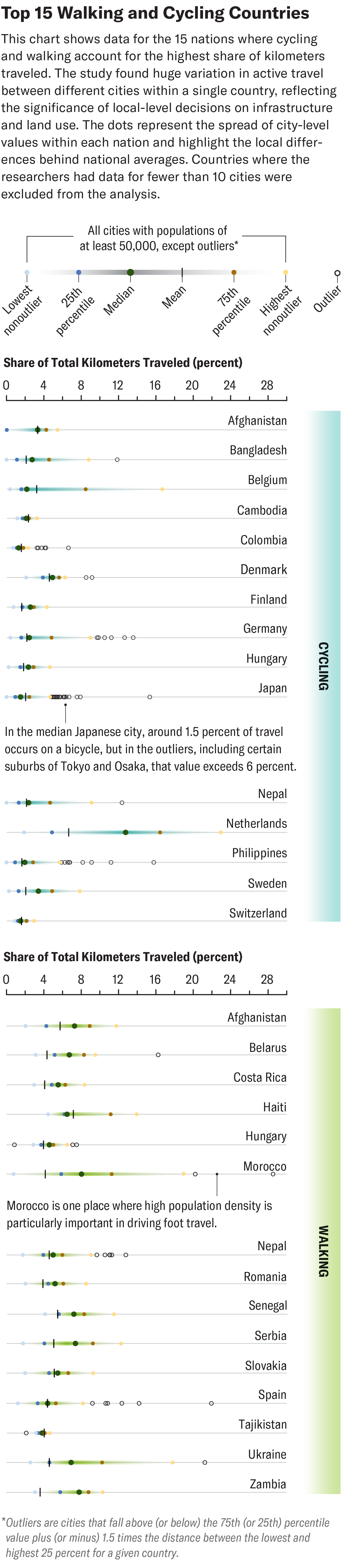 The dot plot shows the percentage of total kilometers traveled on foot and bicycle across cities in the 15 top countries for walking and cycling. Dots are display for the median, mean, 25th and 75th percentiles, and more outlying cities within each country.